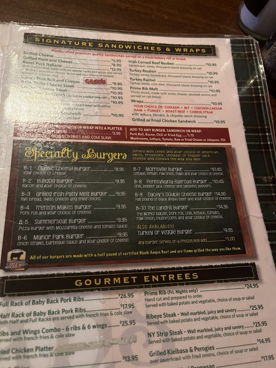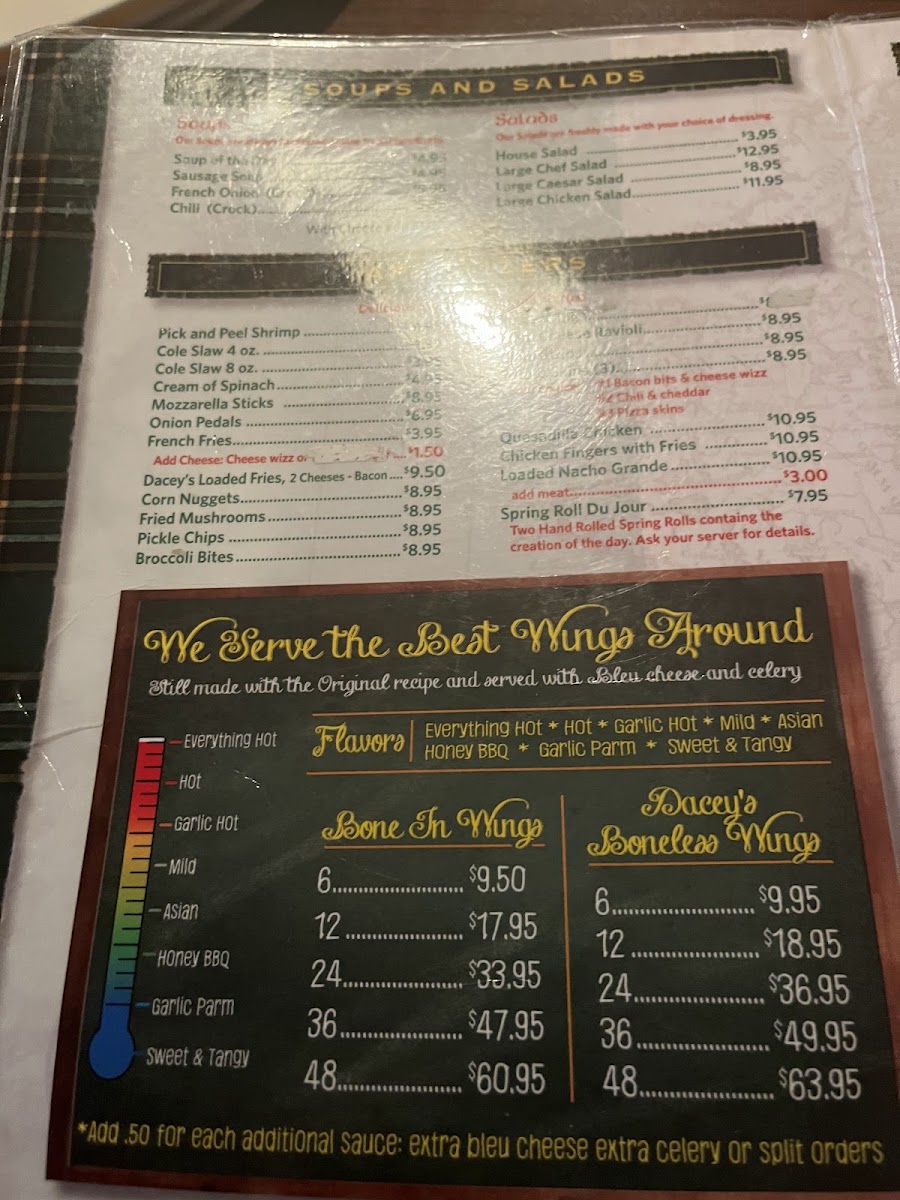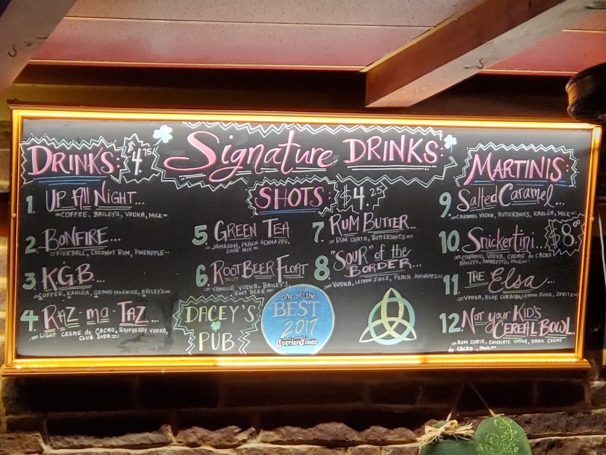 Dacey's Pub offers a straightforward and inviting menu that caters to those looking for satisfying pub fare in a welcoming, cozy setting. The menu strikes a balance between classic comfort dishes and hearty entrées designed to suit a casual night out or a relaxed meal with friends and family.